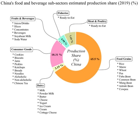 It is noteworthy that China’s food and beverage sub-sectors estimated share of production (2019) are categorized into mainly food grain 65.5% as the top sub-sector, followed by consumer goods 18.31%, meat and poultry 7.45%, fisheries 4.98%, dairy 3.15% and fruits and beverages 0.5%, respectively (Figure 7). The food and beverage products in the sub-sectors are classified according to their high production and demand, for instance the food grains include rice, maize, and wheat as the major produces. Consumer goods comprise cookies, biscuits, noodles, pickles, Chinese herbal tea, and alcoholic and non-alcoholic drinks. Dairy products include liquid milk, powdered milk, cheese, ice cream, yogurt, cottage cheese, and tofu. Seafood and meat products mainly comprise processed and ready-to-eat products, respectively (Figure 7).