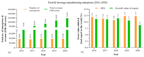 Food and beverage manufacturing enterprise in India (2016–2020). (a) Total number of enterprises and total revenue (INR 100 crore). (b) Gross value added and growth of export (%).