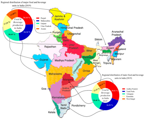 The major food producing industries and their distributions are located in various provinces of India. Thus, the top food and beverage producing industries were categorized into different regions of India. In the northern and western part of India, Punjab and Maharashtra ranked first with 24.14% of production share, followed by Gujarat 20.7%, Uttar Pradesh 7.24%, and the Northeastern side of India i.e., Assam province, with 13.80%, respectively (Figure 9).
