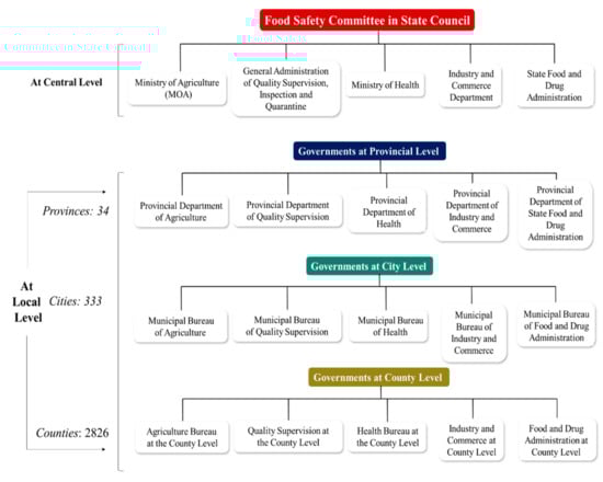 In China, the central governments Ministry of Health (MOH), Ministry of Agriculture (MOA), General Administration of Quality Supervision, Inspection and Quarantine (AQSIQ), Industry and Commerce Department (IAC) and State Food and Drug Administration (SFDA) are in charge of administrative management, but not of inspection services that have direct interaction with the food industry, trade, or the public, as specified in the People’s Republic of China’s Constitution (1982). Local governments are subordinate to the central government and are responsible for implementing laws, according to the Constitution. Article 5 of the FSL, which assigns responsibility for food safety oversight and administration at the county level or higher, sets out the accountabilities for food safety at the local government level. This provides that the executive departments of each government section’s regulatory responsibility (e.g., health, agriculture, quality management, industry and trade, and food and drug administration) must follow this Law and the State Council Regulations. At the local level, there is a hierarchy of three levels of government that are active in the food safety management system, which are provinces, districts, and counties, and each level reports to the level above it. Figure 12 depicts the relationship between departmental oversight and administration at all levels [76].