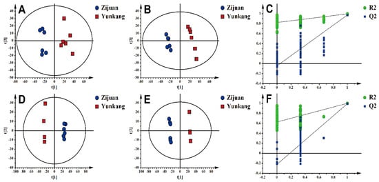 The supervised PLS-DA model, which produced analogous results, was applied to examine the metabolites with the greatest differences. The ZJT samples were clustered within II and III quadrants, and the YKT samples were separated with ZJT samples in I and IV quadrants. These results further confirmed that ZJT and YKT have distinct chemical profiles (Figure 1B,E). Furthermore, R2X, R2Y and Q2 were calculated as 0.519, 0.996 and 0.972 in positive and 0.519, 0.996, 0.991 in negative, respectively, which indicated that the models were established successfully without over-fitting [35]. Permutation had the same results (Figure 1C,F).