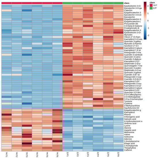 Heat map representing metabolites levels in ZJT and YKT. Red and blue boxes represent values that were higher and lower than the mean value, respectively.
