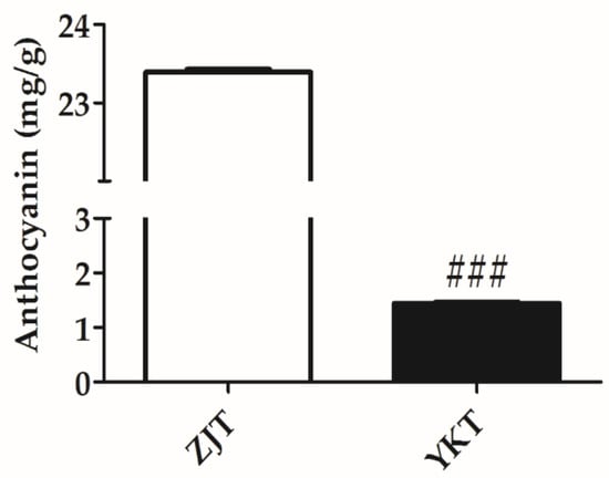 Concentration of anthocyanin in ZJT and YKT (mg/g) (n = 3, mean ± standard error of the mean (SEM)), ### p < 0.001, compared to ZJT.