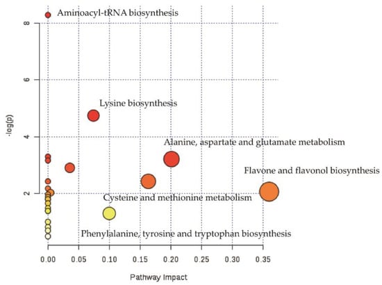 The other two pathways catalyze the formation of dihydroquercetin and dihydromyricetin under a series of enzymes’ action to produce flavonoid glycosides and anthocyanins, whereas most catechins, quercetin glycosides, myricetin glycosides, cyanidin glycosides and delphinidin glycosides are produced by the similar enzymatic reaction. A previous paper reported that transcription levels of anthocyanin synthesis-related genes, including PAL, CHS, CHI, DFR and ANS in ZJT, were high due to activation of the transcription factors bHLH and HY5 which resulted in enhanced anthocyanin synthesis in purple leaves of ZJT [43]. Furthermore, the amino acids biosynthesis pathway analysis showed that shikimic acid, alanine, valine, and aspartic acid were all abundance in YKT (Figure 5). Those two pathways all contribute to the special flavor and color of ZJT [43,50,51].