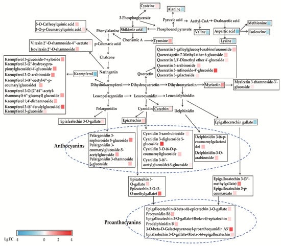 Metabolic pathways of flavone and flavonol biosynthesis and amino acid biosynthesis in ZJT and YKT. Red (LgFC > 0) and blue (LgFC < 0) boxes represent values that were higher and lower than the mean value, respectively.