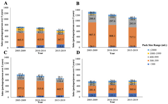 Total package sales per capita, including retail and foodservice sales, over five-year periods from 2005 to 2019 in carbonates according to package size band in (A) Australia, (B) the USA, (C) Canada, and (D) the UK.