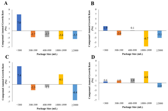 Total per capita unit sales of carbonates were highest in the USA, followed by Canada, Australia, and the UK, between 2005 and 2019 (Figure 1), with the most popular package size being 300–399 mL in these countries. Total per capita unit sales decreased during this time period in Australia, the USA, and Canada but remained relatively stable in the UK. With regard to package sizes, positive growth (per capita CAGR) was shown for <300 mL carbonates, while growth for ≥2000 mL carbonates decreased in all four countries between 2005 and 2019 (Figure 2).