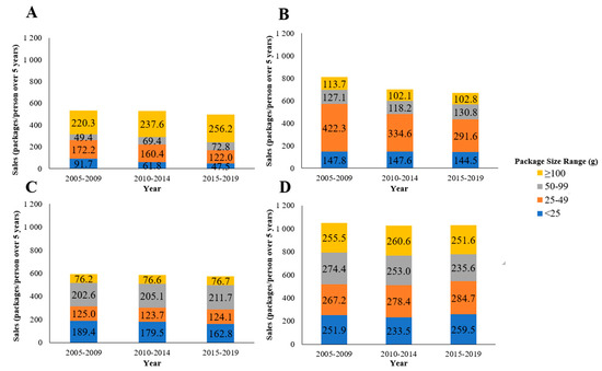 Total package sales in confectionery (retail only) per capita over five-year periods from 2005 to 2019 according to package size bands in (A) Australia, (B) the USA, (C) Canada, and (D) the UK.
