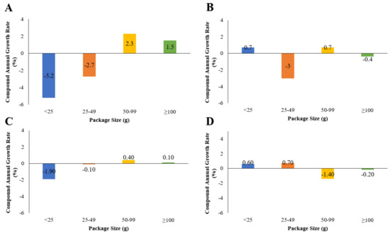 Compound annual growth rate of total package per capita sales of confectionery (retail only) for 2005 to 2019 according to package size band in (A) Australia, (B) the USA, (C) Canada, and (D) the UK.