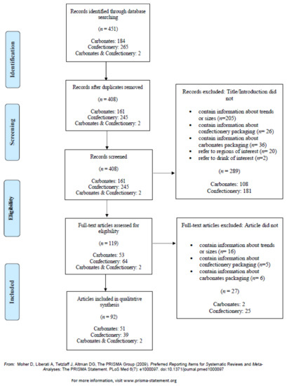 The initial search of the electronic databases identified 451 articles (market reports and trade publications) and, after removal of duplicates, resulted in 408 articles (Figure 5). Following screening of the titles and abstracts/introductions, a further 289 articles were excluded. Full texts were retrieved for 119 articles for detailed evaluation against the eligibility criteria and a total of 92 articles (carbonates, n = 51; confectionery, n = 39; and carbonates and confectionery, n = 2) were included for qualitative synthesis. Articles came from a variety of sources, such as ConfectioneryNews.com, Forbes, Beveragedaily.com, Euromonitor research reports, and direct from company websites. Most of the included articles originated from the UK (particularly confectionery), the USA, or Australia with fewer from Canada. The majority of articles were published after 2013.