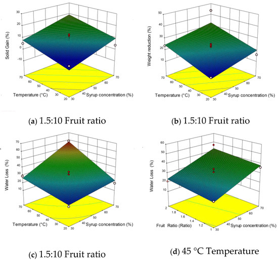 The WL was influenced by all the independent variables investigated in this study. The increase of X1 (F value 107.99) and X2 (F value 80.32) was found to show a stronger increase in WL, suggesting that they had the most significant effects on this response. These results were following fundamental osmotic treatment theories, where the pressure gradient and driving force for mass transfer are strongly linked to syrup concentration and temperature [38]. However, the increase in the fruit-to-syrup ratio has shown a slight increase in WL. It has been previously shown that the increase of the syrup concentration and temperature had a significant effect on the increase of effective diffusivity for both water and sucrose [38]. In general, the syrup concentration and temperature were reported to positively affect the WL and SG of the osmo-dehydrated fruits. Recently, the highest WL and SG in papaya cubes have been recorded at the highest concentration and temperature (60% Bix, 70 °C), and vice versa, the lowest values at the lowest concentration and temperature (30% Brix, 30 °C) [39].
