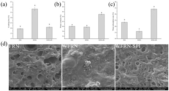 Cooking properties and scanning electron microscopy (SEM) images of flat rice noodles. (a–d) represent cooking loss, moisture content, water absorption, and SEM images respectively; FRN, WFRN, and WFRN-SPI represent the flat rice noodles, whole-grain flat rice noodles, and whole-grain flat rice noodles with soy protein isolate, respectively. Different small letter superscripts in the same histogram are significantly different at p < 0.05.
