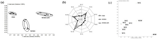 Similar radar plots have been observed for the flavor of the three kinds of flat rice noodles. They all had obvious response values at W5S (sensitive to NOx), W1W (sensitive to sulfide and sulfur-containing organic compounds) and W2W (sensitive to aromatic compounds and organic sulfides). The result was consistent with the analysis of flavor compounds in rice noodles [34]. WFRN-SPI had the strongest response values of W5S, W1W, and W2W, followed by WFRN and FRN. This finding suggested that the flavor of nitrogen oxides, sulfide, sulfur-containing organic compounds, aromatic compounds, and organic sulfur compounds was enhanced with addition of rice bran and SPI. Loading analysis of volatile compounds from flat rice noodles showed that the contribution rates of the first and second principal components in loading analysis were 96.06% and 2.89% respectively, and the total contribution rate was 98.95%, indicating that the analysis results contained the main sample information. The sensors W5S, W1W, and W2W made the biggest contribution to the first principal component, while the sensors W5S, W2W, and W3C (sensitive to ammonia and aromatic compounds) made the biggest contribution to the second principal component. The sensors W5S, W1W, and W2W are farthest from the origin, so they played a key role in distinguishing the volatile compounds of three flat rice noodles.