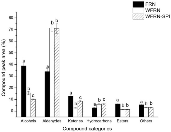 Category distributions of volatile compounds from flat rice noodles. Compound peak area, the percentage of the area of each category to total area of identified compounds; FRN, WFRN, and WFRN-SPI represent the flat rice noodles, whole-grain flat rice noodles, and whole-grain flat rice noodles with soy protein isolate, respectively. Different small letter superscripts in the same group of histograms are significantly different at p < 0.05.