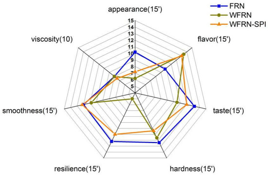 Results of flat rice noodles sensory acceptability are shown in Figure 4. The scores in the figure indicated the preference of consumers for each attribute. FRN had the highest appearance score; this may be because consumers still preferred traditional white flat rice noodles. There were clear differences in hardness, resilience, and smoothness of samples, which was consistent with the texture results above. WFRN and WFRN-SPI had higher scores in flavor, and this result was consistent with the electronic-nose and volatile compounds’ results above. In summary, the global sensory scores of WFRN-SPI were similar with FRN, and the quality of WFRN was not good enough to meet the basic needs of consumers. The sensory evaluation indicated that the quality of WFRN with SPI addition met the basic demands of consumers.