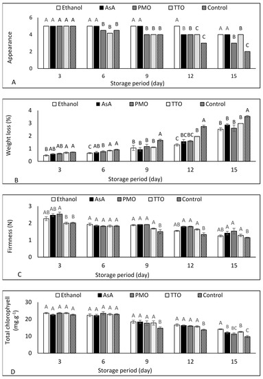 Effect of ethanol, ascorbic acid (AsA), peppermint oil (PMO), and tea tree oil (TTO) on (A) appearance, (B), weight loss, (C) firmness, and (D) total chlorophyll of fresh-cut green bean pods stored at 5 °C for 15 d. Different letters indicate significant differences (p < 0.05) using the Tukey test at every storage point. Data are means of three replicates. Vertical bars represent standard error.