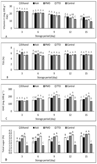 Effect of ethanol, ascorbic acid (AsA), peppermint oil (PMO), and tea tree oil (TTO) on (A) vitamin C, (B) total soluble solids (TSS), (C) total phenolic compound (TPC), and (D) total sugars of fresh-cut green bean pods stored at 5 °C for 15 d. Different letters indicate significant differences (p < 0.05) using the Tukey test at every storage point. Data are means of three replicates. Vertical bars represent standard error.