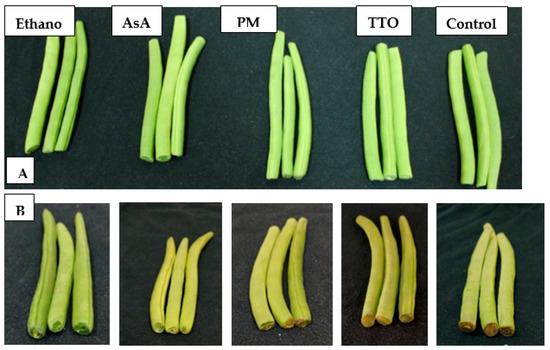 Green bean samples treated with ethanol, AsA, PMO, TTO, and control after (A) 3 d and (B) 15 d of storage at 5 °C.