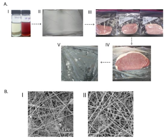 (A) (I) Spin dope solutions for electrospinning; (II) active nonwovens coated commercial linear low-density polyethylene (LLDPE); (III) treatments tested: CON (O.1)—LLDPE commercial packaging without a functional nonwoven component; Film 1 (O.2)—a commercial LLDPE film coated with a polycaprolactone/chitosan nonwoven; Film 2 (O.3)—a commercial LLDPE film coated with a polycaprolactone/chitosan nonwoven fortified with Colombian PE; (IV) example of coating during use; and (V) example of coating following use. (B). Scanning electron micrographs of (I) Film 1; (II) Film 2.