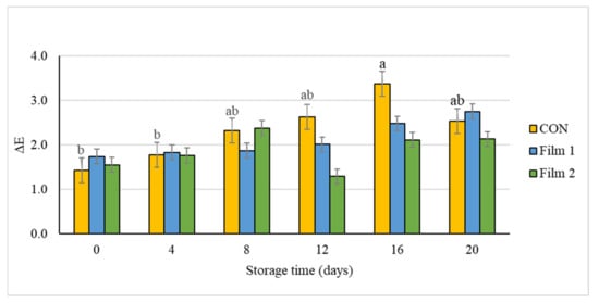 Changes in the color of meat during prolonged periods of storage can be indicative of lipid oxidation processes, protein oxidation processes, and microbiological contamination []. During the 20 days storage, there was a significant difference for instrumental lightness values among treatments on day 8, where the L* was greater (p < 0.05) in Film 2 samples as compared with Film 1 and CON samples. Instrumental redness (a*) value, which is an indicator of freshness for red meat, decreased during the 20 days storage period for all treatments. Samples trapped in Film 2 retained their initial redness for four days longer than the other treatments (day 0 compared to day 4), as reflected by the lower a* value for Film 2 samples on day 0. On day 12 of the storage period, pork samples wrapped in Film 1 and Film 2 had greater a* values compared with those wrapped in the CON film. This observation is indicative of the greater storage ability of samples with the coated films. For instrumental yellowness (b*) values, significant differences were observed on day 0 and day 12. On day 0, yellowness values were lower (p < 0.05) for Film 2 samples compared with Film 1 and CON samples. By contrast, on day 12, yellowness was greater for Film 1 samples compared with CON samples, while Film 2 samples were intermediate in value and not different compared with Film 1 and CON samples. The ΔE value is an indication of total color change over time and is often a meaningful instrumental color parameter to monitor during storage or display of meat products. The ΔE value of pork chops was affected during the storage time in CON samples in which ΔE value on day 16 was higher than on day 0 and day 4 (Figure 2). However, there were no significant changes in ΔE value for Film 1 and Film 2 samples throughout the storage period. This indicates improved color stability and thus preservation of color of Film 1 and Film 2 samples during the 20 days storage period. These results suggested that the antioxidant properties of chitosan and/or PE might have helped prevent the oxidation of the myoglobin protein and change in chemical state from myoglobin to metmyoglobin. Other studies have also confirmed that the addition of chitosan and PE either directly on samples or on edible films in meat matrices had a protective effect from oxidative deterioration [,,].