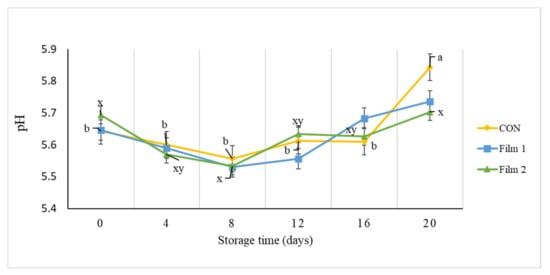 There was an increase (p < 0.05) in pH for CON samples on day 20 of the storage period compared to the other sampling days (Figure 3). No changes (p > 0.05) in pH were observed for the Film 1 samples during the storage period. The pH value of Film 2 samples on day 20 was higher than that on day 8, which may be indicative of the growth of lactic acid bacteria during the first 8 days of storage, due to the lag phase of PE release. These results may suggest that the chitosan and/or PE nonwoven coated LLDPE films could moderate the increase of pH for pork during the storage period. These findings lead to the speculation of two possible explanations. First, the increase in pH could be attributed to the accumulation of volatile basic nitrogen compounds from the action of microorganisms []. Second, endogenous meat proteases might have been involved in the change of pH during storage. It is possible for endogenous meat proteases to denature proteins during storage, causing an increase in the formation of free amino acids and peptides [,].