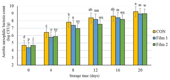 Aerobic mesophilic bacteria count of pork loin chops wrapped in active packaging for 20 days at 4 °C storage. Treatments included the following: CON—a commercial linear low-density polyethylene (LLDPE) film without a functional nonwoven component; Film 1—a commercial LLDPE film coated with a polycaprolactone/chitosan nonwoven; Film 2—commercial LLDPE film coated with a polycaprolactone/chitosan nonwoven fortified with Colombian propolis extract. abcd, mnop, wxyz Different letters indicate significant differences (p < 0.05) for the main effect of storage day for each respective treatment when a significant difference was detected. Note: no significant differences (p > 0.05) were detected for treatment × day, and no significant differences (p > 0.05) were detected for the main effect of treatment within each day.