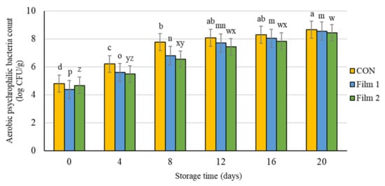 Aerobic psychrophilic bacteria count of pork loin chops wrapped in active packaging for 20 days at 4 °C storage. Treatments included the following: CON—a commercial linear low-density polyethylene (LLDPE) film without a functional nonwoven component; Film 1—a commercial LLDPE film coated with a polycaprolactone/chitosan nonwoven; Film 2—commercial LLDPE film coated with a polycaprolactone/chitosan nonwoven fortified with Colombian propolis extract. abcd, mnop, wxyz Different letters indicate significant differences (p < 0.05) for the main effect of storage day for each respective treatment when a significant difference was detected. Note: no significant differences (p > 0.05) were detected for treatment × day, and no significant differences (p > 0.05) were detected for the main effect of treatment within each day.