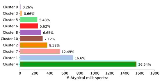 Figure 2, the size of the clusters varied from 11 milk spectra (0.26% of all spectra) in cluster 9 to 1554 milk spectra (36.54%) in cluster 4. Because some factors that cause milk spectra to be atypical are more likely than others, variability in the size of the clusters is expected. Interestingly, out of 4253 spectra, only 11 milk samples with similar spectral characteristics were necessary to form a distinct cluster. This indicates how sensitive cluster algorithms can be in detecting very small groups of atypical spectra—even within large datasets.