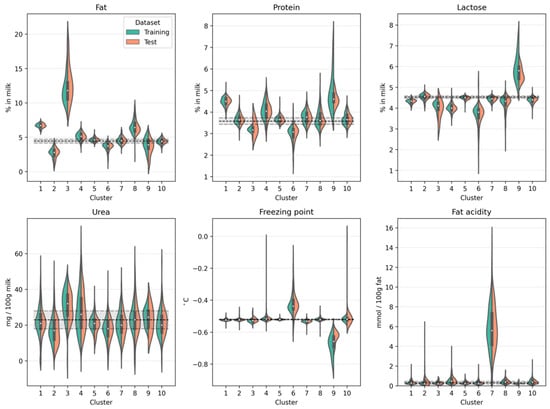 Figure 3 shows for both the training dataset and the test dataset the compositional milk profile on a cluster-by-cluster basis. Notice the similarity of the distributions when comparing the training and test dataset. This shows that our cluster solution generalizes to new data and does not merely describe peculiarities in our specific training set. The compositional milk profile also allows for an initial characterization of the clusters so that hypotheses can be made about the underlying root cause. For example, cluster 3 is characterized by an increased fat content of up to 22%. This can be the consequence of insufficient mixing of milk before sampling. Therefore, if untargeted screening methods identify an atypical milk spectrum which is subsequently classified as belonging to cluster 3, it is most likely because the milk has a drastically increased fat content as it was not homogeneously sampled. Cluster 6, on the other hand, is marked by a decreased protein and lactose concentration but an increased freezing point. This is typical for extraneous water in the milk [