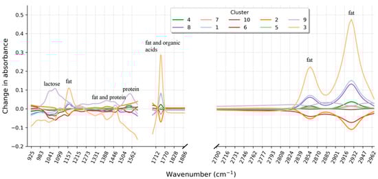 24]. Individual milk spectra categorized as belonging to cluster 9 could therefore indicate economically motivated adulteration. The ability to identify such cases makes it possible to initiate further target-oriented chemical analyses and contact with the farm for clarification. Although informative, milk spectra can also be atypical for reasons other than those found in the compositional milk profile. For clusters 5 and 10, for instance, the compositional milk profile does not seem to provide relevant diagnostic information. It is therefore also important to focus on the characteristic spectra of the clusters.