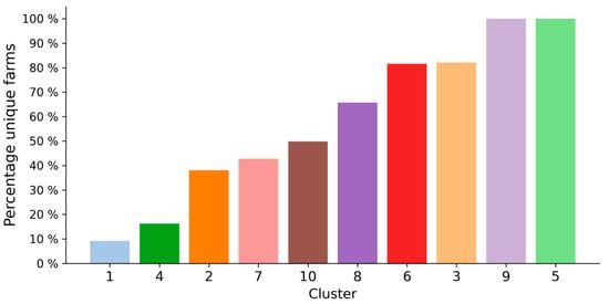 Figure 5, most of the distinct clusters have a proportion of unique farms in between 40 and 80%. For example, 43% of all the spectra in cluster 7 belong to different farms. Considering the actual size of the cluster, it can be calculated that the 529 spectra in cluster 7 belong to 227 different farms. This also means that, considering a period of almost 3 years, a farm in cluster 7 will have on average 2.3 atypical spectra in this cluster. This could be indicative of certain factors more prominent at these farms. Knowledge about these factors (e.g., factors leading to increased mechanical strain of milk) could then be used to take preventive measures. We also found two clusters, cluster 1 and cluster 4, where the proportion of unique farms was particularly low (9.33 and 16.34%, respectively). This indicates that the majority of atypical spectra correspond to milk supplies from relatively few farms. In cluster 5 and cluster 9, on the contrary, all spectra belong to different farms. This could either mean that the underlying cause affects farms only incidentally or that the reason is not located at the farms but instead at the laboratory where the FT-IR measurements take place.