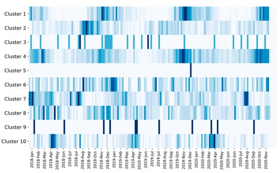 Figure 6, we visualized per cluster the distribution of milk samples over time. This makes it possible to identify the extent to which a cluster primarily describes milk that is atypical because the underlying root cause has a seasonal profile (such as feeding and variation in temperature). Moreover, it can be useful to know whether the underlying root cause is confined to a temporally isolated event or whether it is more permanent. In our dataset, most of the clusters do not appear to have a seasonal profile but are evenly distributed across the three-year period. This suggests that the clusters are stable in the sense that the underlying root causes exist throughout the year and are likely to be permanent. For example, the few spectra belonging to cluster 9 were discovered evenly throughout a period of three years and each spectrum corresponds to milk from a different farm. This is not indicative of a systematic intentional adulteration, where multiple milk samples from the same farms are expected to be affected over a certain period of time. Nevertheless, evidence suggests that atypical spectra belonging to cluster 9 will also be found in the future, and this may justify further target-oriented analyses concerning these milk samples or the farms they are coming from. We also identified clusters with a seasonal profile. As can be seen in