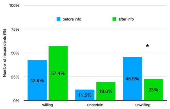 Willingness to taste an energy bar enriched with cricket flour. Difference in number of respondents (%) on the willingness to taste the cricket bar, before and after the information, among three different groups. Groups were defined using a 7-point Likert scale (1 = strongly disagree, 7 = strongly agree): willing (from 5 to 7), uncertain (point 4) and unwilling (from 1 to 3); number of respondents of the unwilling group decreased significantly * p < 0.001.