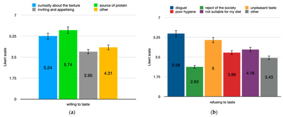 - After the athletes expressed their willingness to taste the insects, two separate groups were identified (taster/no taster) and the factors which influenced their choice, i.e., curiosity about the texture, palatability, and alternative protein source for the tasters, and disgust, suitability for society, personal diet, poor hygiene and fear of unpleasant taste for the no tasters, were investigated using a 7-point Likert scale.