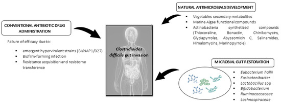 The present review aims to provide a global view on the most effective alternative antimicrobials found in vegetable, bacterial, and marine sources against C. difficile and the possibilities of these materials to exert inhibitory and bactericidal potential in order to contribute to increasing the current knowledge on future clinic and nutraceutical supplements to be administered as therapy in CDI mitigation (Figure 1). In the present study, a review was performed based on published literature on PubMed, Google Scholar, EMBASE, BIOSIS, and Web of Science databases from 2000 to 2021. The terms included to obtain results were as follows: “natural antimicrobials”, “marine bioactives”, “Clostridium difficile”, “therapy”, “marine antimicrobials”, “marine drugs”, “algae”, and “gastrointestinal disease”.