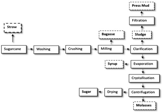 The resulting by-products from harvesting include tops and straw, while the wastes from the sugar processing steps are bagasse, press mud and molasses (Figure 1) [15]. Based on their composition (Table 1), this biomass has potential for use as bio-based products among different sectors, such as food, bioenergy and bio bulk materials [11].
