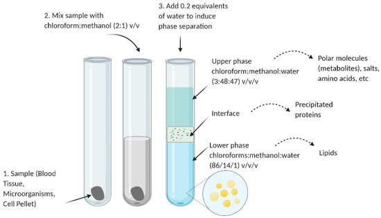 In the isolation of lipids, Folch extraction (Figure 3) is the gold standard [52]. The procedure, originally developed to be assayed on biological samples, takes advantage of a biphasic solvent system consisting of chloroform:methanol:water [53]. Based on this idea, a rapid and less solvent-consuming method was proposed in 1959 by Bligh and Dyer [53,54]. This method was performed on wet tissue homogenized with a mixture of chloroform and methanol, forming a miscible system of chloroform:methanol:water at a 2:2:1.8 (v/v/v) proportion.
