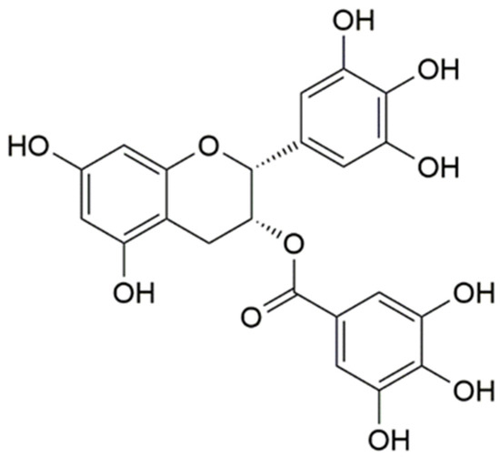 Epigallocatechin-3-gallate (EGCG, Figure 1) is the most important component of catechol, which is well known for its natural antioxidant activity [1]. Many epidemiological and preclinical trials have shown that EGCG can reduce the risk of cancer, cardiovascular, and neurodegenerative diseases [2]. Due to its strong antioxidant and pharmacological activities, EGCG can be used as an antioxidant and synergist in food and pharmaceuticals [3]. However, EGCG is unstable and prone to autoxidation and oxidation into less active substances; it has low bioavailability when taken directly [4]. Moreover, EGCG is easily soluble in high polar solvents, such as water and ethanol, which has poor liposolubility and membrane permeability, and its high polarity reduces its cellular adsorption capacity [5,6]. Therefore, the EGCG encapsulation inside drug delivery systems is one of the strategies currently used in overcoming these drawbacks. Nanoparticles (NPs) are often used as drug delivery vehicles due to their small size, good biocompatibility, and low toxicity [7]. To promote the application of EGCG in food and pharmaceuticals, loading EGCG into nanocarriers can improve its performance, such as stability, prevention from oxidation, and bioavailability [8,9,10].