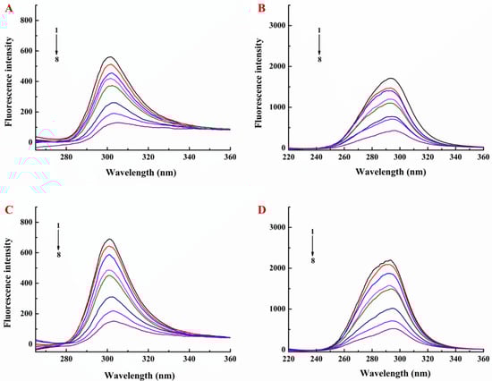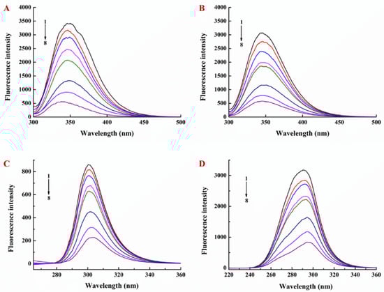 Fluorescence emission spectra of EGCG-lysozyme/pectin nanoparticles with lysozyme/pectin mass ratio of 1:1 (A) at 25 °C and (B) at 35 °C and with lysozyme/pectin mass ratio of 1:2 (C) at 25 °C and (D) at 35 °C.