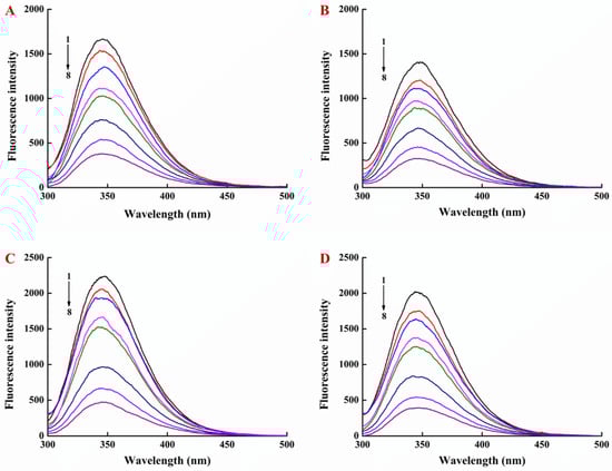 Firstly, the interactions between different concentrations of EGCG and LY, as well as those contained in NPs, were investigated by fluorescence spectroscopy. LY has been previously reported to have a strong fluorescence peak near 346 nm [29], based on which, in this study, we investigated the fluorescence emission spectra within the range of 300–500 nm at a fixed concentration of LY (0.5 mg/mL) and different molar ratios of EGCG to LY (0:1, 0.2:1, 0.4:1, 0.8:1, 1:1, 2:1, 3:1, and 4:1). As shown in Figure 2A,B, with the increasing EGCG concentration, the fluorescence intensity of the LY emission peak decreased, indicating that the interaction between EGCG and LY caused the regular quenching of LY endogenous fluorescence. With the increasing temperature, the intensity of LY endogenous fluorescence also decreased [27].