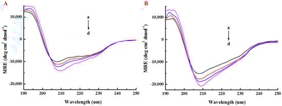 Far-UV CD spectra of (A) lysozyme and (B) lysozyme/pectin nanoparticles with lysozyme/pectin mass ratio of 1:1 in the presence and absence of EGCG at pH 7.0, [EGCG] = 0.1 mg/mL. The EGCG/lysozyme molar ratio was (a–d) 0:1, 1:1, 2:1, and 4:1.