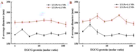 The particle size of LY/Ps NPs, added with different EGCG concentrations, was measured using dynamic light scattering (DLS) for evaluating the stability of the NPs. At 0 h post-NPs’ storage time, we found that, at the mass ratio of LY to Ps of 1:1, different concentrations of EGCG addition into PBS solution (pH 7.0) did not change the particle size of LY/Ps NPs, whereas, at the mass ratio of LY to Ps of 1:2, the particle size of LY/Ps NPs was larger than that at the mass ratio of LY to Ps of 1:1 (Figure 6A). At 24 h post-NPs’ storage time, we observed that, when the molar ratio of EGCG to LY ranged from 1:1 to 128:1, the particle size of EGCG-LY/Ps NPs slightly changed, and when the mass ratio of LY to Ps was 1:1, the particle size was smaller than that when the mass ratio of LY to Ps was 1:2 (at the same concentration of EGCG) (Figure 6B). The particle size of the NPs placed at room temperature for 24 h exhibited no significant difference from that for 0 h, which indicated that EGCG might react with LY immediately after the addition of EGCG to LY solution.