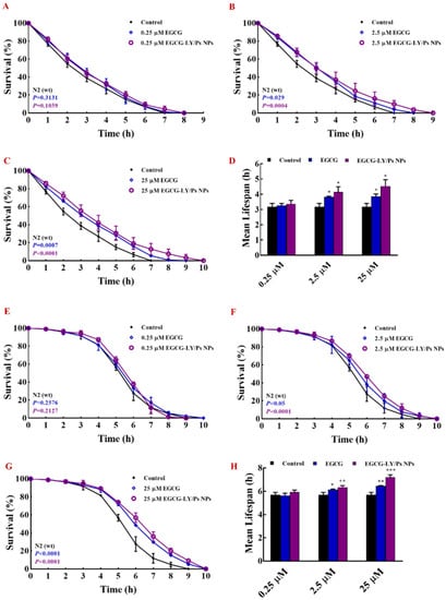 (A–C) Survival rates and (D) mean lifespan of C. elegans under heat stress. (E–G) Survival rates and (H) mean lifespan of C. elegans under oxidative stress under different concentrations of free EGCG and EGCG-lysozyme/pectin nanoparticles treatments.