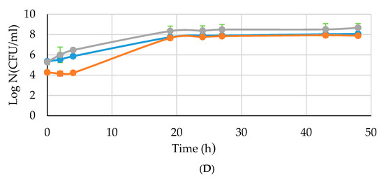 Growth curve of the strains 2, 7, 47 and S122 in synthetic medium. Symbols indicate different samples as blue circle (control), orange circle (temperature-pretreated) and grey circle (ethanol-pretreated). (A) S. cerevisiae 2; (B) S. cerevisiae 7; (C) S. cerevisiae 47; (D) S. cerevisiae S122.