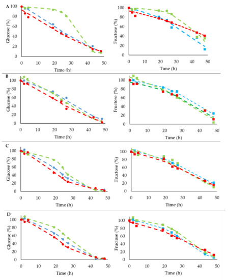 Observed and predicted with sigmoidal model (dashed lines) data related to glucose (left, circles symbols) and fructose (right, square symbols) by four strains after different pretreatments. (A) Strain coded 2, (B) strain coded 7, (C) strain coded 47, (D) strain coded S122. Type of pretreatments showed with different colors: blue—control, green—temperature, red—ethanol pretreatments.