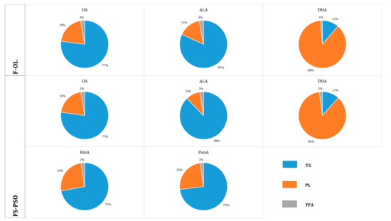 Incorporation of oleic acid (OA), α-linolenic acid (ALA), docosahexaenoic acid (DHA), rumenic acid (RmA) and punicic acid (PunA) into different lipid fractions (triglycerides (TG), phospholipids (PL), and free fatty acids (FFA)) of egg yolk. F-OL: hens’ feed supplemented with 10 wt % olive oil. FS-PSO: hens’ feed supplemented with 7.8 wt % flaxseeds and 7 wt % pomegranate seed oil.
