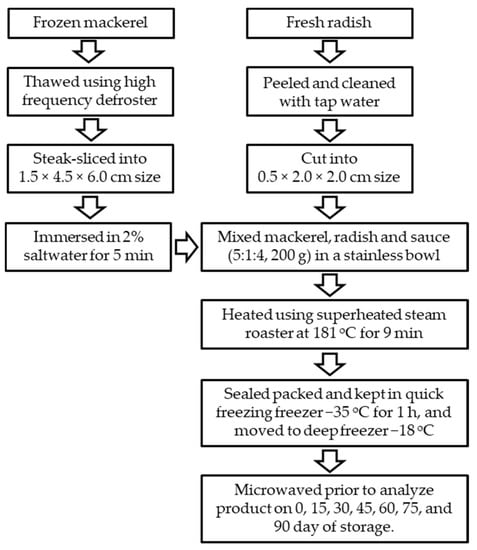 Mackerel can be cooked using various methods, including frying, boiling, smoking, and braising. Braised mackerel with radish is a popular dish in Korean cuisine and is known as godengeo-mu-jorim []. Braised mackerel is prepared by combining a sauce with fish and radish to improve its taste and eliminate the fishy smell. A HMR product containing braised mackerel with radish might become a popular healthy convenience food. Several technologies can be applied to maintain the quality of a HMR product containing braised mackerel with radish. Several technologies applied in the heating of HMR products, such as those containing hagfish [], Pacific saury [], squid [], and pen shells [], have been reported. In the aforementioned studies, HMR products were prepared using a superheated steam roaster (SSR), which can maintain food texture, improve product quality, reduce oxidation, and shorten the heating process. To date, these findings have primarily focused on heating methods, although material preparation and postproduction freezing are also required to produce high-quality products.