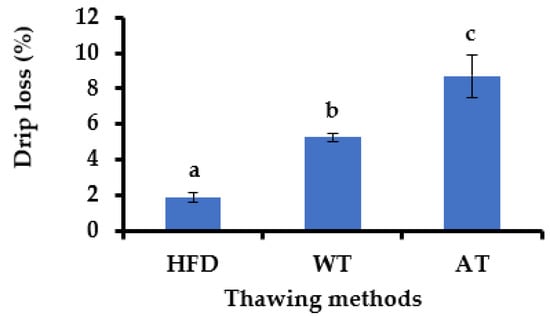 Drip loss (%) of frozen raw mackerel after thawing process using high-frequency defroster (HFD), water thawing (WT), and air thawing (AT). The data are shown as the mean ± standard error of the mean (SEM). The means with different letters are significantly different between thawing methods (Tukey’s test, n = 3, p < 0.05).