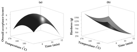 The three-dimensional response surface graph of overall acceptance showed an increased score with increasing temperature and time but decreased when it reached the optimal condition of 180.625 °C for 9.0316 min (Figure 3a). The hardness value of the radish decreased continuously with an increase in the heating time and temperature (Figure 3b).