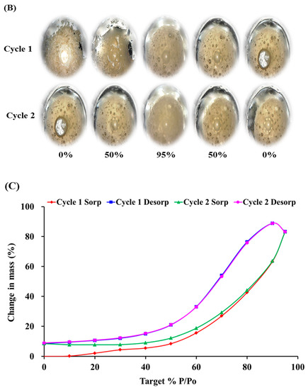 Dynamic vapor sorption measurements (from 0% to 95% RH) of SHs flour: (A) Water vapor sorption kinetic. (B) Changes of appearance shape. (C) Isotherm plot for SHs flour at 25 °C.